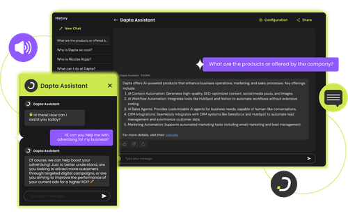 Dapta te permite entrenar a la IA para que maneje llamadas específicamente adaptadas a tu negocio. Puedes configurar el tono de voz, las respuestas frecuentes y los flujos de conversación para asegurar que la IA comunique tu mensaje de forma coherente con tu marca y objetivos.